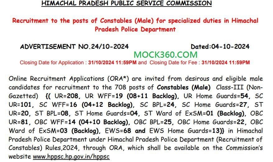 Himachal Pradesh Police Constable Recruitment 2024: Himachal Pradesh Public Service Commission (HPPSC) has announced the recruitment of 1088 Constable vacancies in the Himachal Pradesh Police Department. Interested candidates can apply online from 04 October 2024 to 31 October 2024. This recruitment is a great opportunity for those who meet the eligibility criteria and are looking to serve as a police constable in Himachal Pradesh. Make sure to read the complete notification before applying.